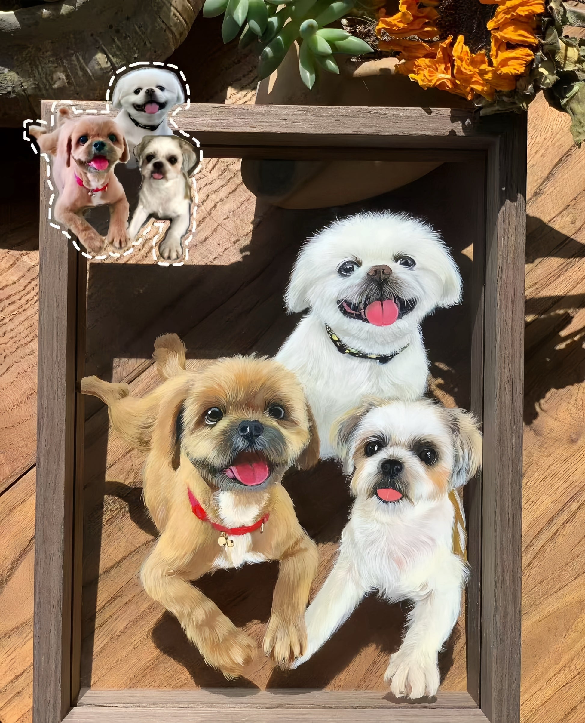 Celebrate the unique personalities of your beloved pets with a custom, hand-painted portrait of three animals. Each artwork is carefully crafted by our skilled artists, capturing every detail—from the softness of fur to the sparkle in their eyes. Painted with eco-friendly, non-toxic acrylic paints that are free of formaldehyde, the colors are vibrant, safe, and designed to last without fading.